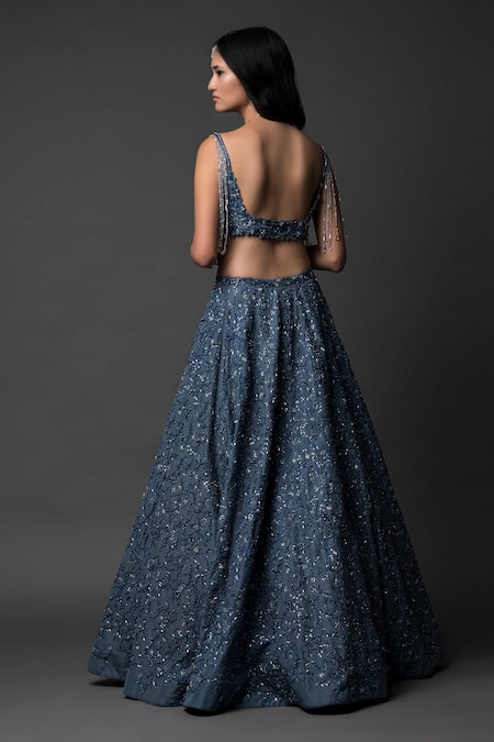 Blue Silk, Net Pearls, Sequins, Crystals Sweetheart Hand Embroidered Lehenga Set