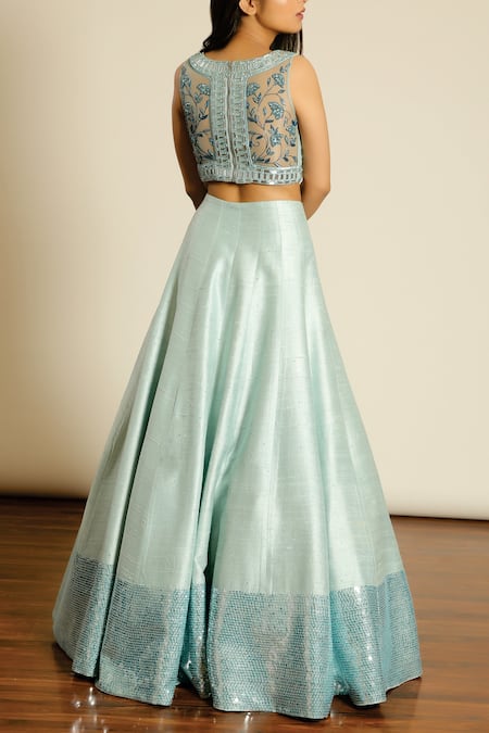 Icy blue sleeveless padded crop top featuring persian galore embroidery with crystals, sequins, and cutdana highlights. Paired with an attached cancan kalidaar lehenga showcasing sequin jaal broad border embroidery.