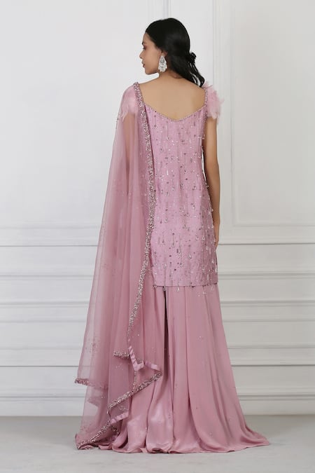 Mauve kurta with Swarovski crystals, bead & sequin work. Paired with sequin embellished sharara & tulle embroidered dupatta with tassel detailing at the hem.