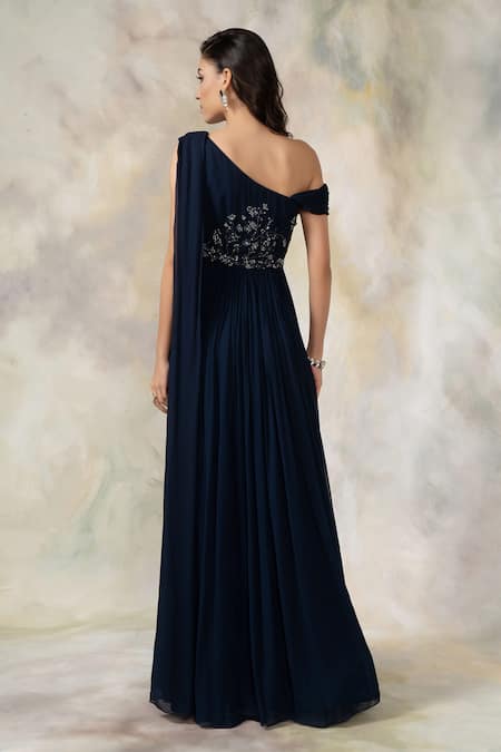 Midnight blue one shoulder gown with floral embellished motifs & draped detail.