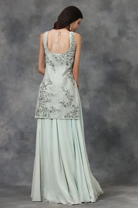 Pista kurta with floral embellished Swarovski beads, crystals & cutdana. Paired with sharara & dupatta.