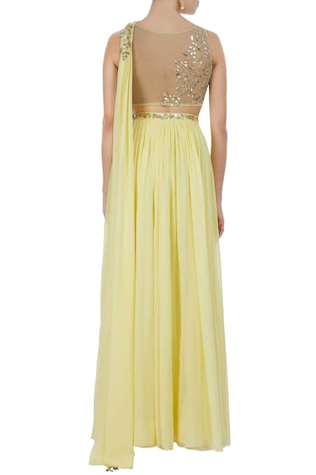 A bright lemon yellow georgette blouse that is enhanced with cutdana embroidery and attached draped dupatta. It comes with embellishment on the waist band of the lehenga.
