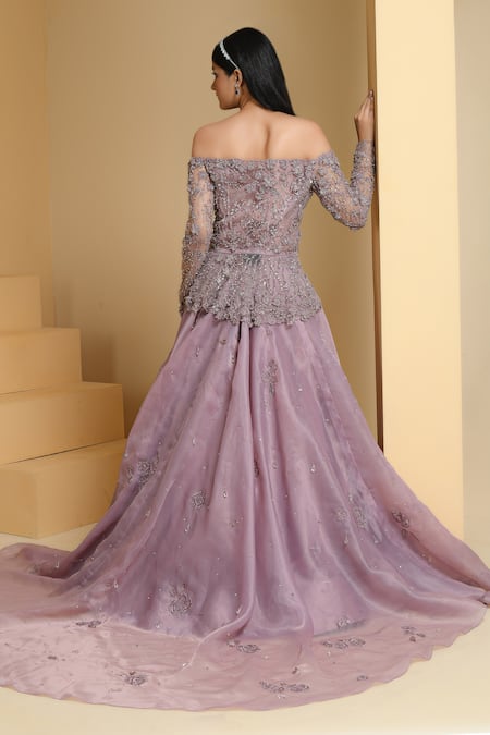 Purple peplum top with off-shoulder sweetheart neckline and full sleeves, adorned with crystal, sequin, and bead embellishments. Paired with a matching wide flare organza skirt featuring a train embellished with crystals.