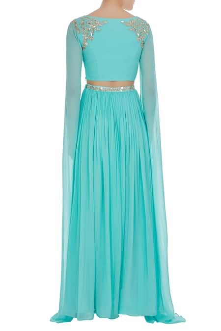 In an attractive blue shade, this cape sleeve crop top and pleated lehenga skirt can be worn on any grand festive occasion. The hand embroidered top features sheer cape sleeves while the waist band is enhanced with hand gota and sequin embroidery.