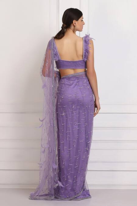 Purple saree with Swarovski crystals, bead, sequin work & embellished pallu. Comes with feather sleeve blouse.