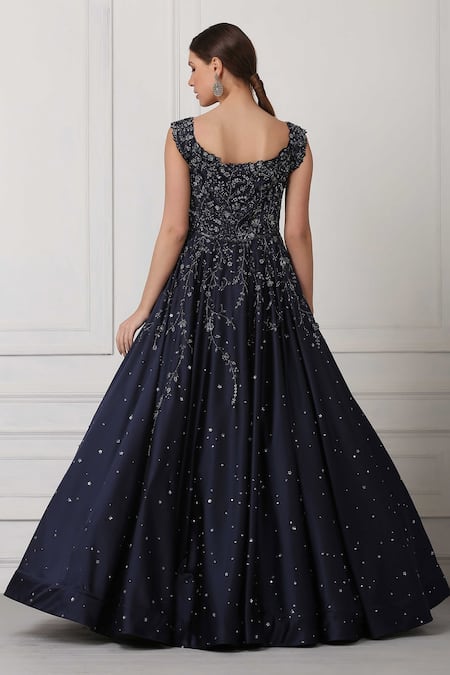 Navy blue gown with Swarovski crystals, bead, sequin, cutdana work & an embroidered waist belt.