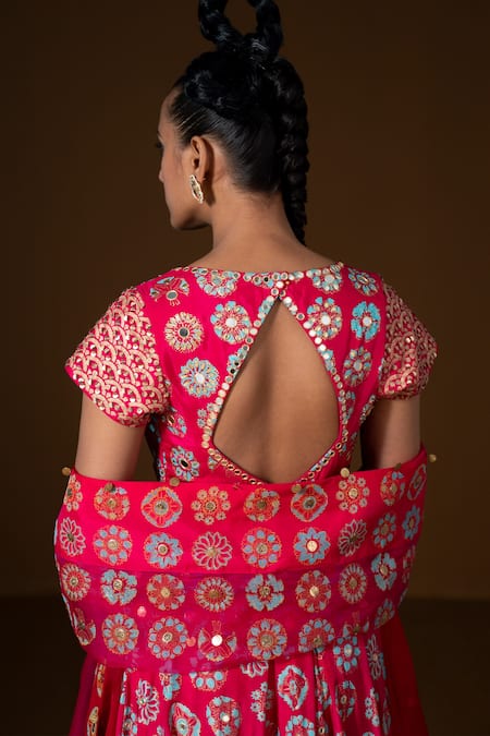 Fuchsia Anarkali featuring tropical print with geometric and sequin embroidered borders. Paired with a metal coin bordered dupatta and has a back keyhole detail.