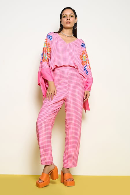 Pink shirt featuring a V neck, flared sleeves, and checkered print with butterfly motifs
