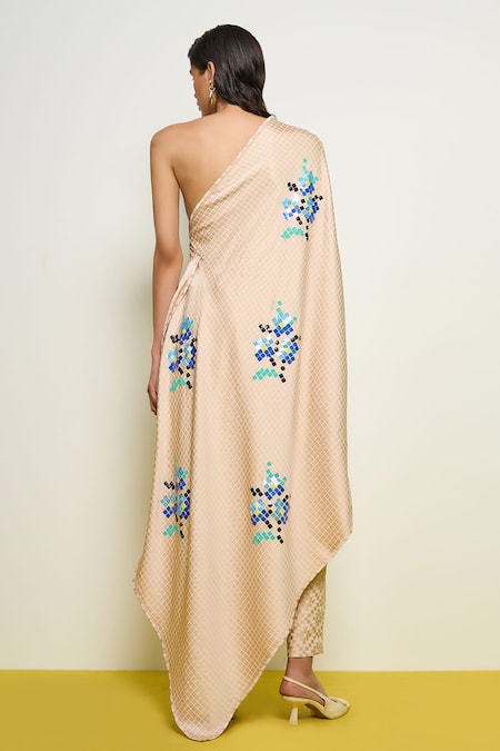 Beige satin one-shoulder kaftan featuring checkered print and sequins hand embroidery. Paired with coordinating pant for a complete look.