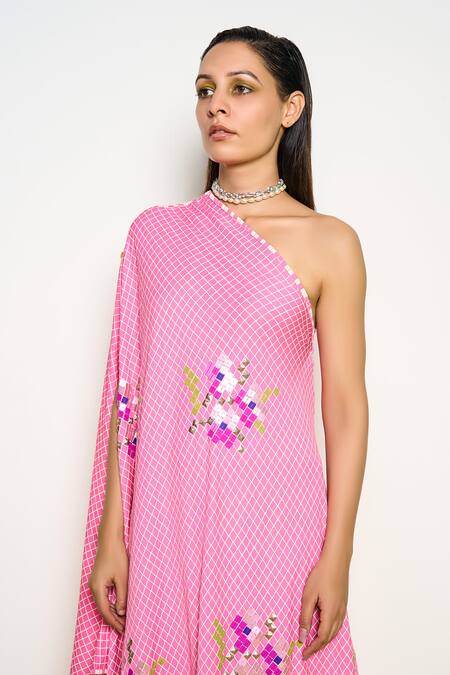 Pink one-shoulder kaftan in double georgette featuring checkered print and sequins hand embroidery. Paired with coordinating printed pant.