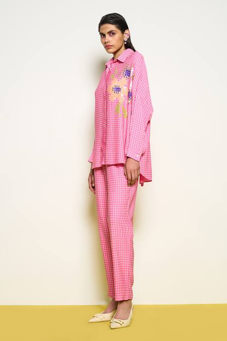 Pink double georgette shirt featuring a checkered print with hand-embroidered sequins