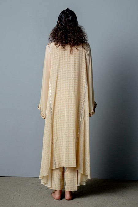 Ivory and gold printed kurta with hand embroidered detail. Paired with printed hem pant.