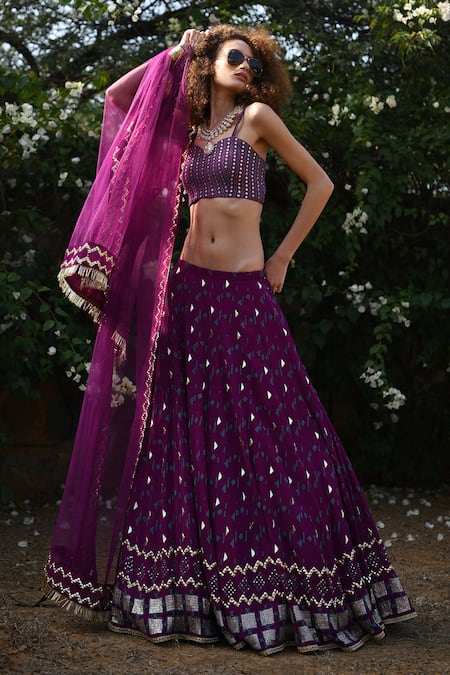 Aubergine 18 kali lehenga highlighted with all-over print and geometric sequin hand embroidery. Comes sweetheart neckline blouse and net dupatta.