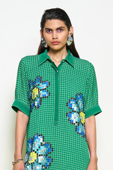 Green dress featuring a chequered pattern with wildflower hand embroidery and sequin studs