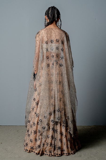 Beige Organza, Georgette Bead Work, Block Print, Mosaic Cape Lehenga Set