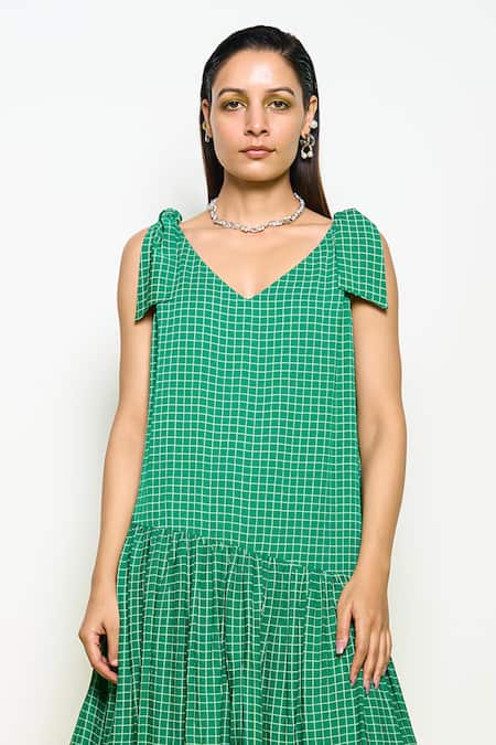 Green Georgette Sequins V-neck Honeycomb Checkered Print Dress