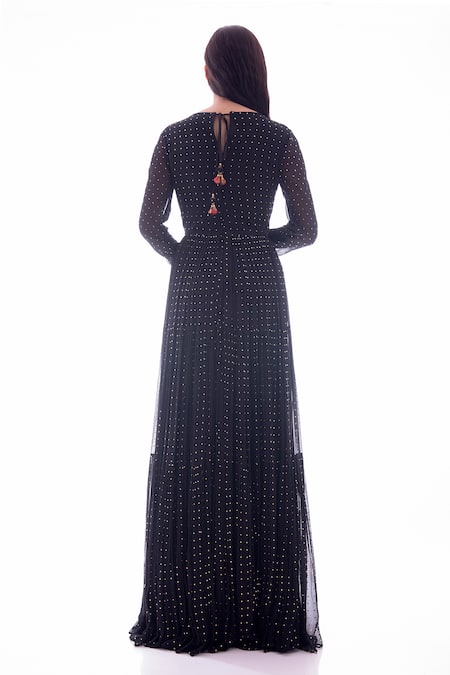 Black teir anarkali with overall gold dew dots embellished. Paired with floral banarasi patch duptta and a crepe pant.