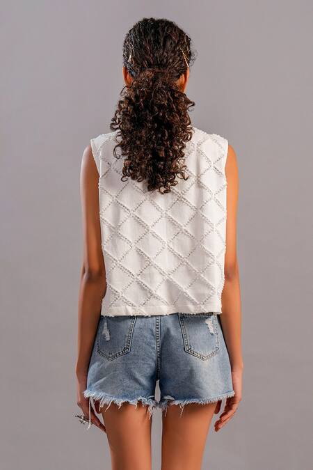 White Denim, Terrycloth Cut Work Round Neck Modular Muse Top