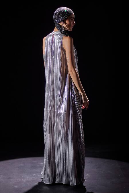 Silver Faux Leather High Neck Pleated Maxi Dress