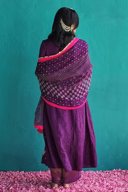 Purple kurta featuring thread and sequin embroidery in a floral pattern. Paired with a matching pant and a contrast bordered sheer dupatta.