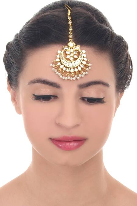 Gold polished floral motif maangtikka featuring faux pearls and kundan work