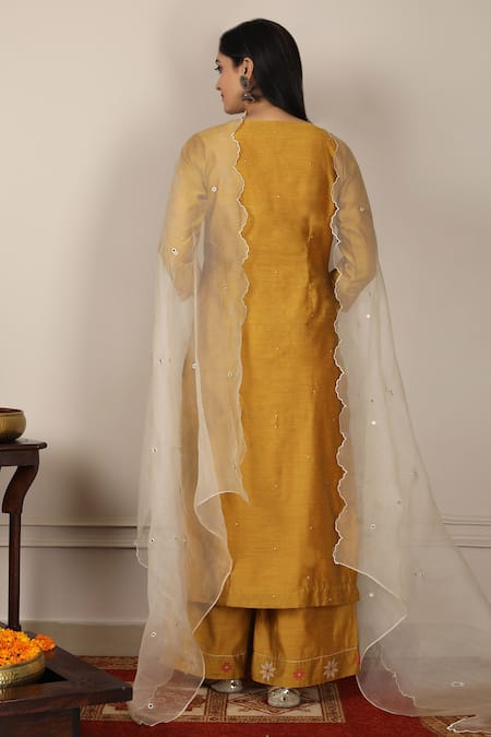 Ochre yellow kurta with floral embroidered motifs. Paired with floral embroidered palazzo & organza mirror work dupatta.