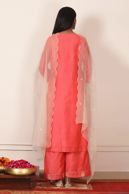 Coral kurta with floral embroidered motifs. Paired with floral embroidered palazzo & organza mirror work dupatta.