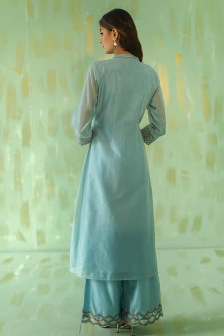 Blue Organza, Chanderi, Lining Cotton Mirror, Sequin, Zari Kurta Pant Set