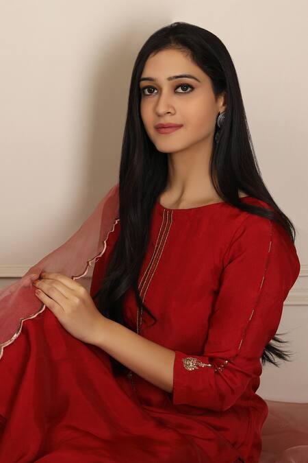 Deep red kurta with cutdana, sequin embroidered detail. Paired with organza panelled, embroidered palazzo & contrast dupatta.