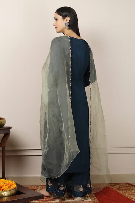 Teal blue kurta with cutdana, sequin embroidered detail. Paired with organza panelled, embroidered palazzo & contrast dupatta.