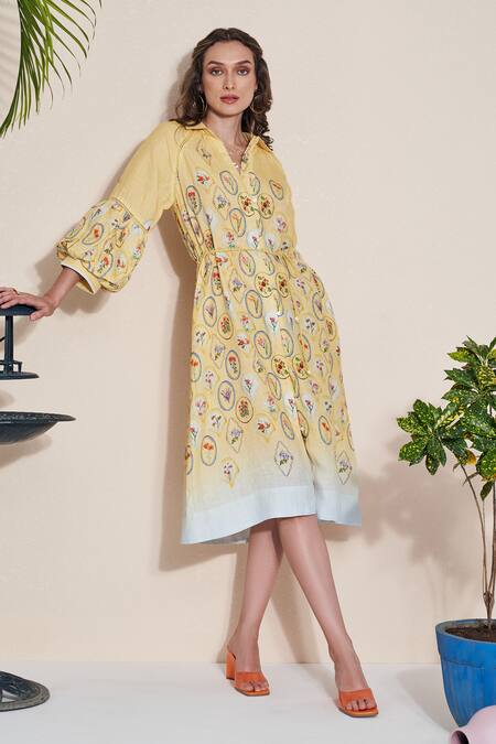 Yellow Hemp Collared Floral Print Skye Shirt Dress