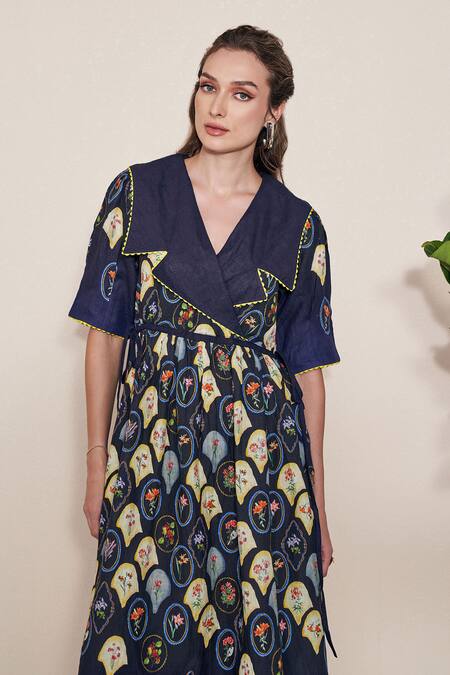 Black Hemp Embroidery Collared Floral Printed Lapel Midi Dress