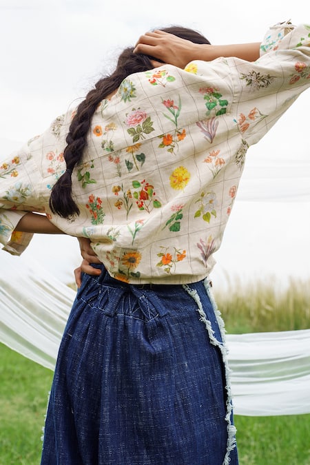 Balloon sleeves >Button placket on sleeve cuffs >Tie-up detail on sleeve hems >Front tie-up detail >Closure: Front button placket, Note:, Pant worn by model is not for sale.