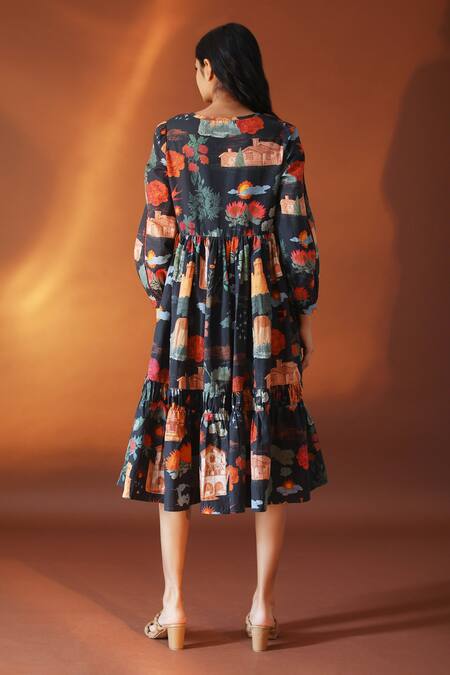 Black hemp & cotton blend floral printed tiered midi dress.