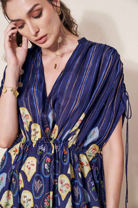 Blue Silk V-neck Moxie Printed Hemp Kaftan