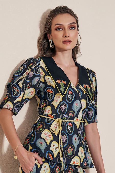 Black peplum top featuring a floral embroidered collar and half sleeves