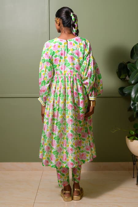 White & green balloon sleeves gathered flare kurta featuring an all over Florence art print. Paired with a matching print pant and a printed dupatta.
