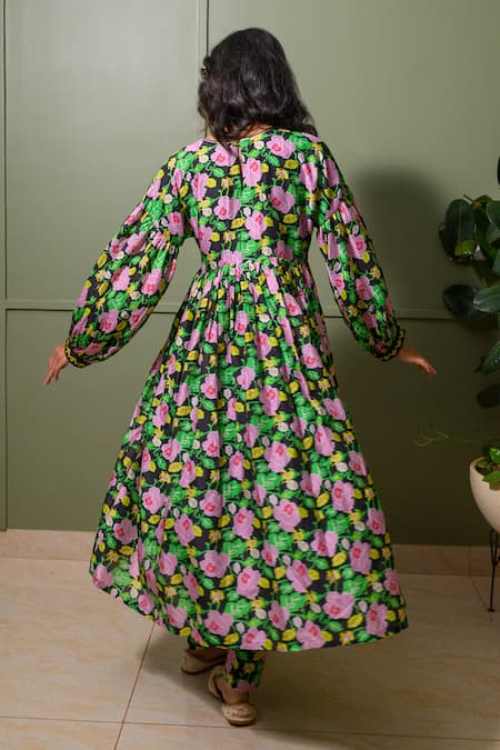 Black & green balloon sleeves gathered flare kurta featuring all-over Florence art print. Paired with matching print pant and dupatta.