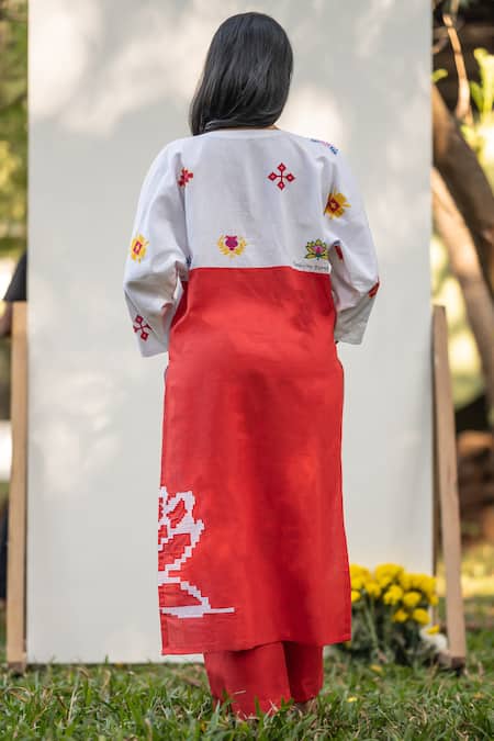 White kurta featuring Portuguese folk motifs, patchwork, and pin tuck detailing on the yoke. Paired with solid red pleated loose pants.