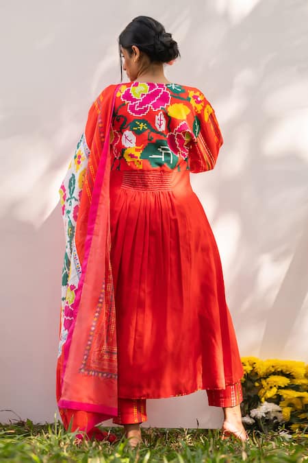 Buy_Prachi Kamat_Orange Chanderi, Muslin Embroidery Round Neck Portuguese Folk Anarkali Pant Set