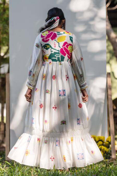 Buy_Prachi Kamat_White Chanderi Round Neck Portuguese Folk Print Tiered Maxi Dress _Online_at_Aza_Fashions