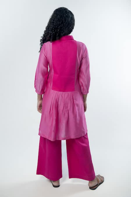 Pink chanderi kurta featuring placement affirmation quote embroidery at the back, elasticated cuffs, and gathered detailing. Paired with matching poplin pants with side pockets.
