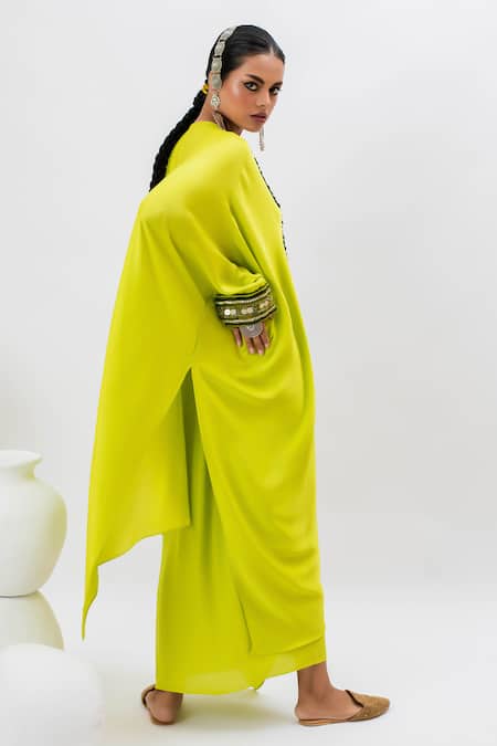 Neon green kaftan featuring hand embroidered ajrakh border lace on the yoke. Paired with a stitched wrap skirt, this set showcases intricate sequin, zari, and thread work.