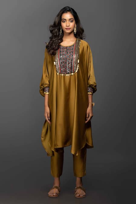 Gold mustard anti-fit kurta with Ajrakh embroidery & coin embellishments. Comes with slim fit pants and hand embroidered Ajrakh dupatta.