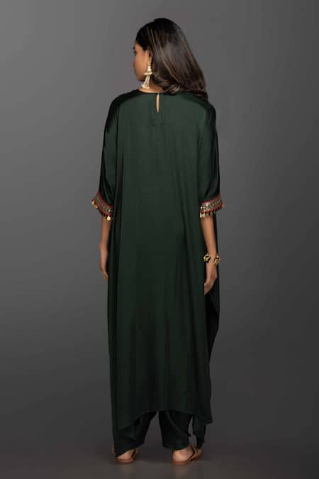 Forest green kaftan style kurta with Ajrakh embroidery & coin embellishments. Comes with dhoti pants.