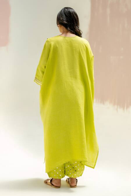 Sublime neon green longline kaftan kurta featuring a relaxed silhouette. Paired with stylish pants adorned with embellishments.