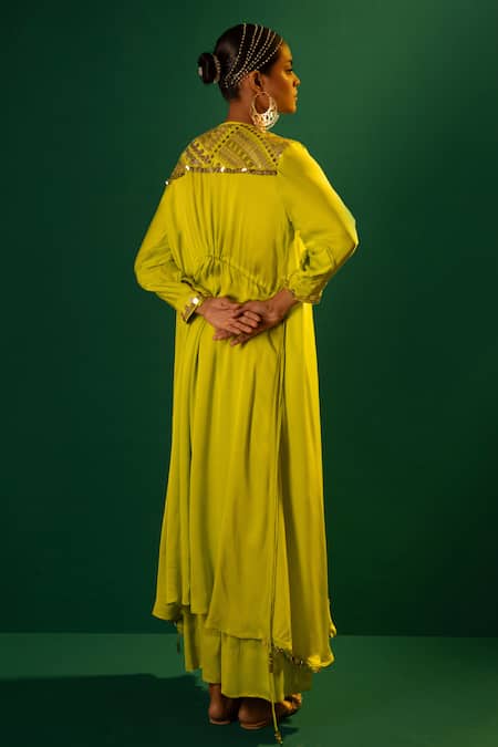 Neon green kurta featuring hand embroidered mirror and sequins borders with attached tie-up detailing. Paired with coordinating palazzo pants.