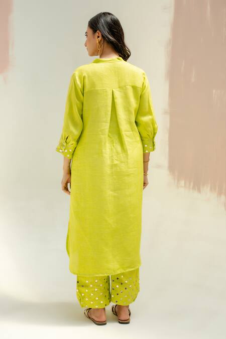 Sublime neon green kurta made from pure linen featuring a straight cut and button closure. Paired with hand embroidered pants adorned with intricate detailing.