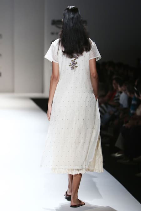 Off-white chanderi kurta with floral French knotted embroidered motifs & polka dots all-over. It comes with a crinkled cotton inner.