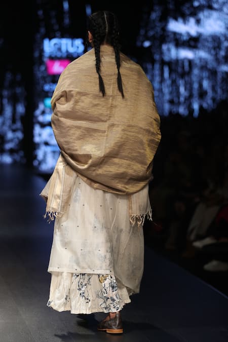 Ivory dress with rich Indian craftsmanship detailed on a canvas making this palatial embroidered dress a must-own elegant addition. Teamed with a gold-tinted, beige shawl, this bewitching beauty ensures breathtaking access.